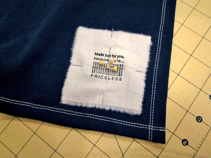 - Position the label in the bottom right corner, approximately ⅜” in from the inner hem seam lines along the side and bottom edges. Pin in place.