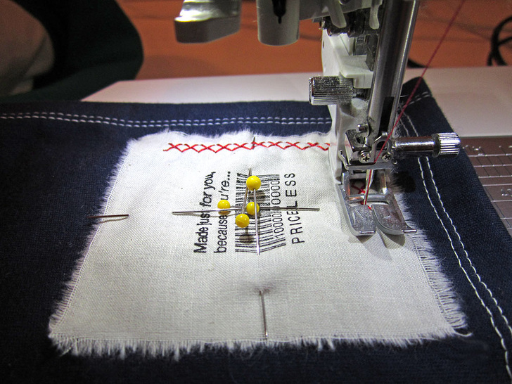- Stitch in place around all four sides with a plain or decorative stitch. We used a decorative cross stitch pattern.