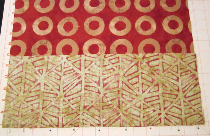 - Find one exterior inset panel and one exterior wrap-around panel. Place the two panels right sides together along one 16″ edge to create a vertical seam. Pin in place.