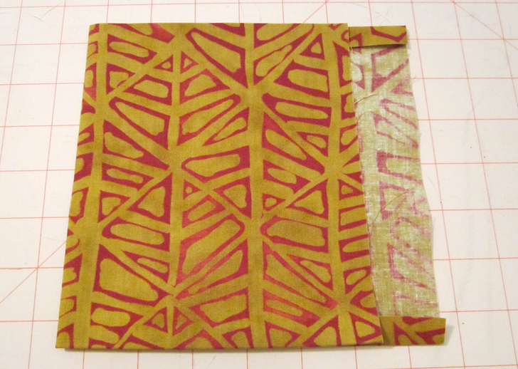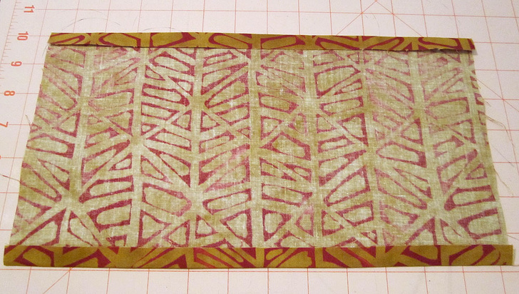 NOTE: The photo below was taken prior to adhering the interfacing. You should apply the interfacing first as listed above. - Using a ½” seam allowance, stitch together. Press the seam allowance open.