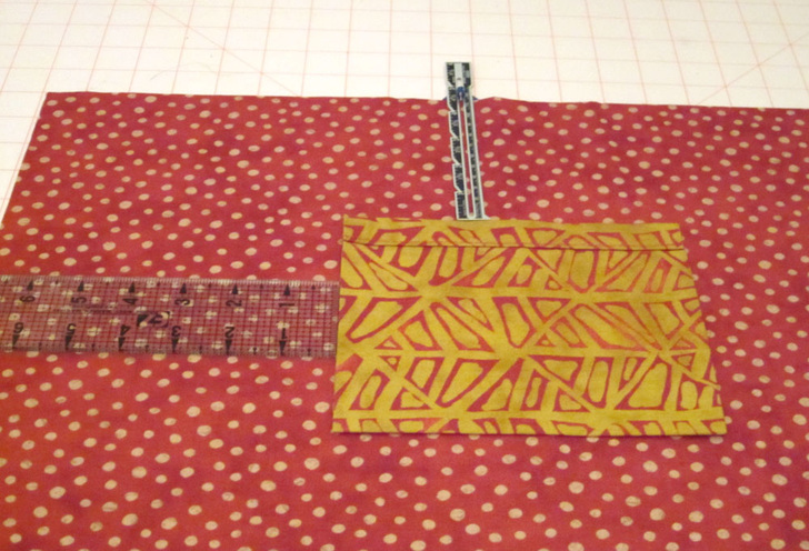- From the fabric for the bag’s exterior front and back inset panels and the two interior pockets (Gold Furrows in our sample), fussy cut the following: