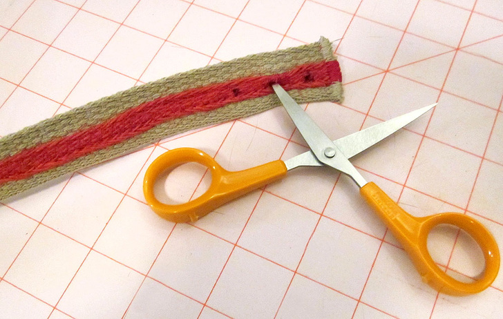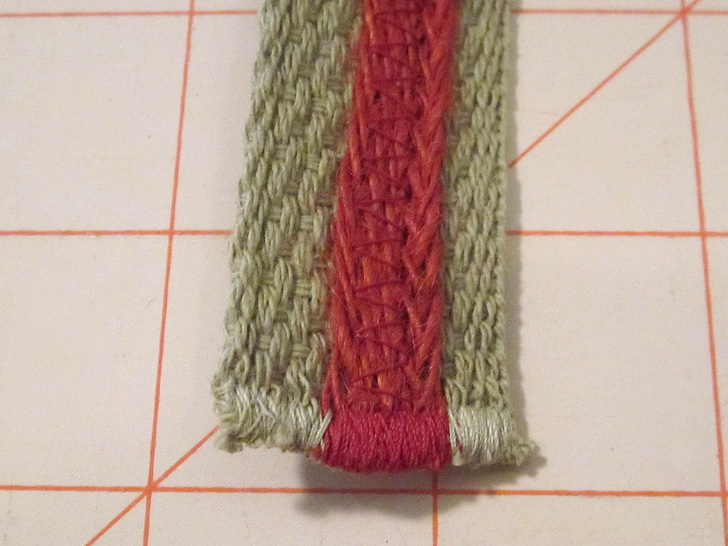 - Finish both ends of each length of webbing with a tight zig zag stitch, stopping and changing thread color if you have an accent strip.