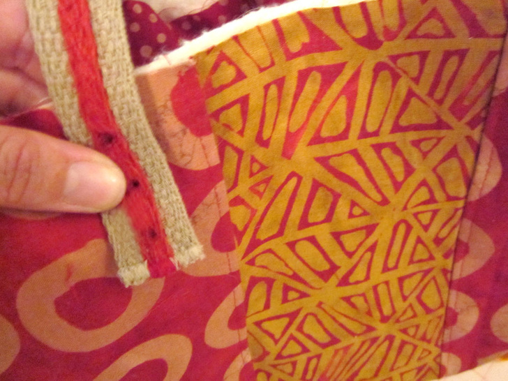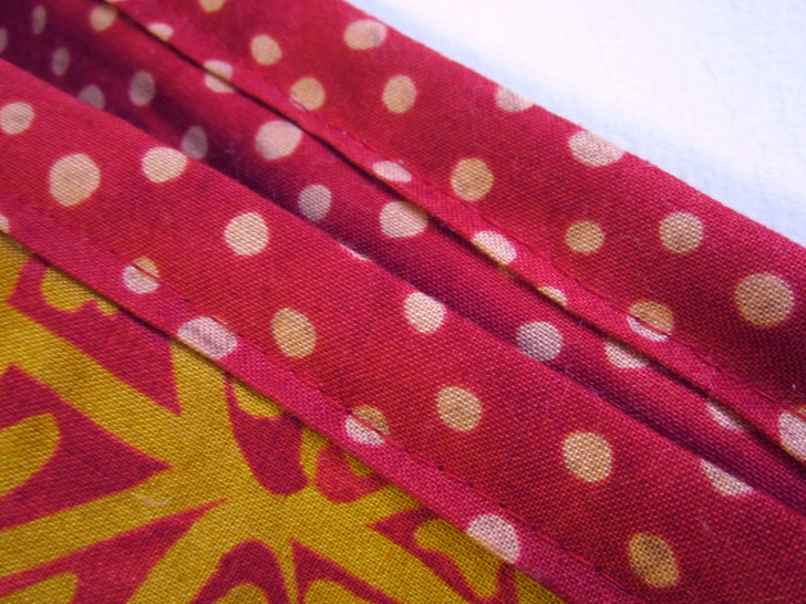 - Starting at the center of one side of the bag, slip the binding over the top raw edges of the bag. Pin in place all around. When you get back to your starting point, tuck under the raw edge to create clean edge and overlap to finish.