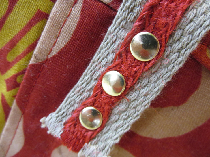 NOTE: You can add a small square of interfacing to the wrong side of the bag to further secure the rivets. We found our two layers of jute plus the fabric, interfacing and batting had enough stability to handle the rivets quite well without interfacing.