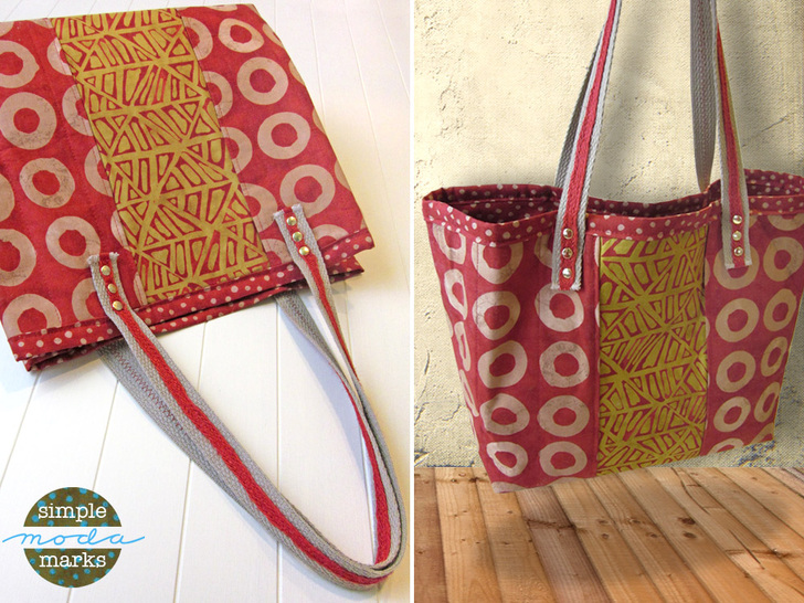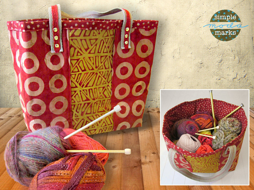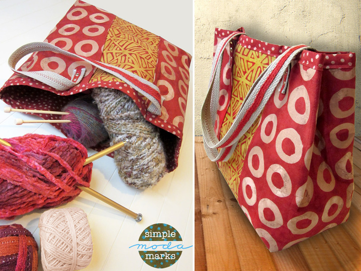 Skinny little carryalls getting you down? Then it’s time to go big and bold with today’s jumbo tote! With its 6″ base and sides, you can fill it with lots o’ stuff. Throw it over your shoulder to transport your latest project wherever you need to go. When you’re back home, it’s pretty enough to sit next to your favorite chair and hold all your in-progress supplies. We made ours to hold knitting, but it would be equally wonderful for any jumbo job. As with all the projects this week, our bag is made in Malka Dubrawsky’s gorgeous Simple Marks collection for Moda Fabrics. We chose a large motif with a bit of a random pattern and didn’t want to make any unecessary cuts through it that would chop up the design. So, we came up with unique wrap-around sides. Rather than the seams going directly down the sides, the main body of the bag joins in the front and back with inset panels. This allows the sides to be single beautiful pieces that really showcase the motif.
