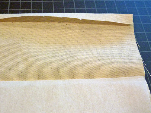 - Find the four exterior panels and the four fusible interfacing panels. Place the interfacing on the wrong side of each exterior panel. On the lower panels, all four sides of both layers are flush. On the upper panels, the interfacing should be flush along both sides and along the bottom. Across the top it should sit 3½” down the raw edge of the fabric. This will allow the self-facing to remain without interfacing.