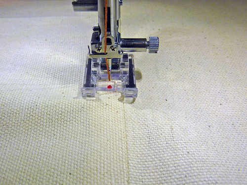 - Re-thread with the heavier, contrasting thread in the top and bobbin. Increase the stitch length.