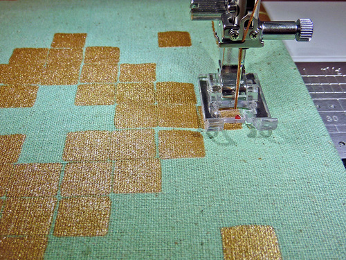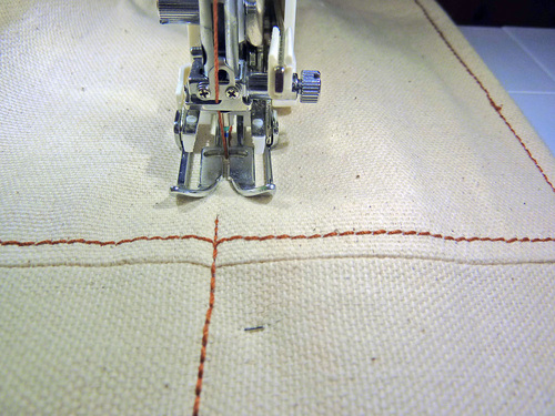 - Re-thread with the heavier, contrasting thread in the top and bobbin. Slightly increase the stitch length.
