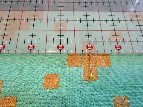 - On the lower unit, place your ruler along the center dividing line of the pocket so the ruler reaches the top raw edge of the lower unit. Place a pin at this point.