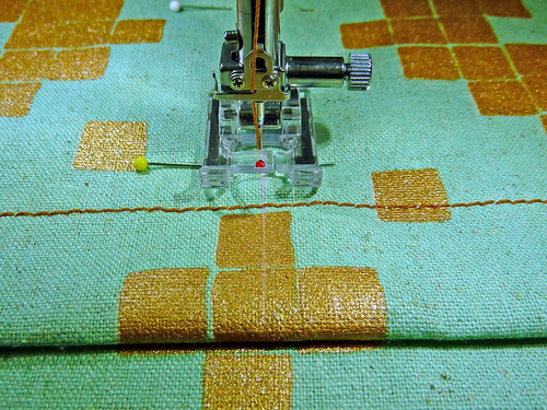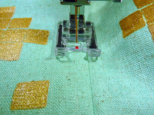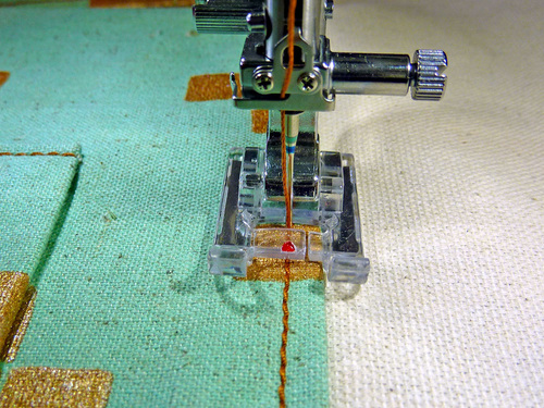 - Re-thread with the heavier, contrasting thread in the top and bobbin. We also switched to our Even Feed foot to help handle the multiple layers. You could also engage your machine’s built-in fabric feeding system.
