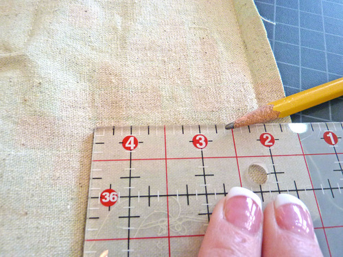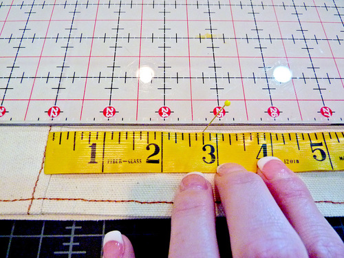 - Starting on the bag front, measure 2¾” to the right of the center topstitching (the actual topstitching – not the seam line) and 2¾” to the left of the topstitching.