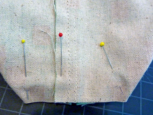- The seams are off-set. On the front, align one seam of the upper unit with that center pin point marker you set into the lower unit. You should be aligning the topstitching line on the upper unit with the center dividing stitch line on the pocket (that is what your center pin point should relate to).