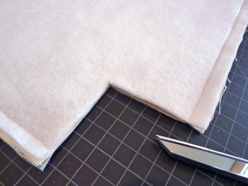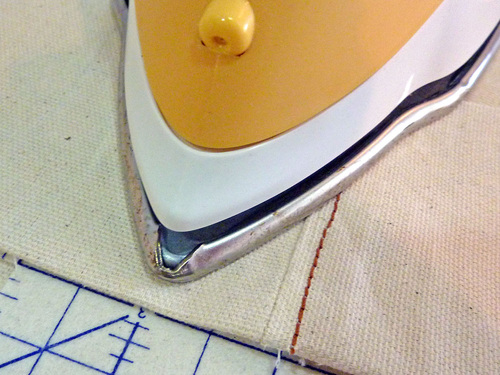 NOTE: We decided to add the extra fusible interfacing during our second sample prototype. So, if the interfacing seems “missing” from some photos, don’t worry. The construction steps shown remain the same, with or without interfacing. - Press each seam allowance together and to one side.