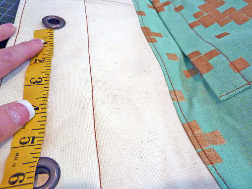 NOTE: If you are new to this technique, we have a great Metal Grommets Tutorial. - With the two front grommets in place, measure from the outside edge of one front grommet 5¾” towards the side of the bag. Make a mark at this measurement, as above, it should be centered within the two lines of horizontal facing topstitching.