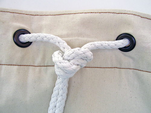 - With these handle loops in place, and the bag’s top completely open, grasp both ends of the rope and tie them into a knot. Cinch the knot up against the side of the bag between the grommets. Cinch the knot tightly but keep the fabric between the grommets flat.