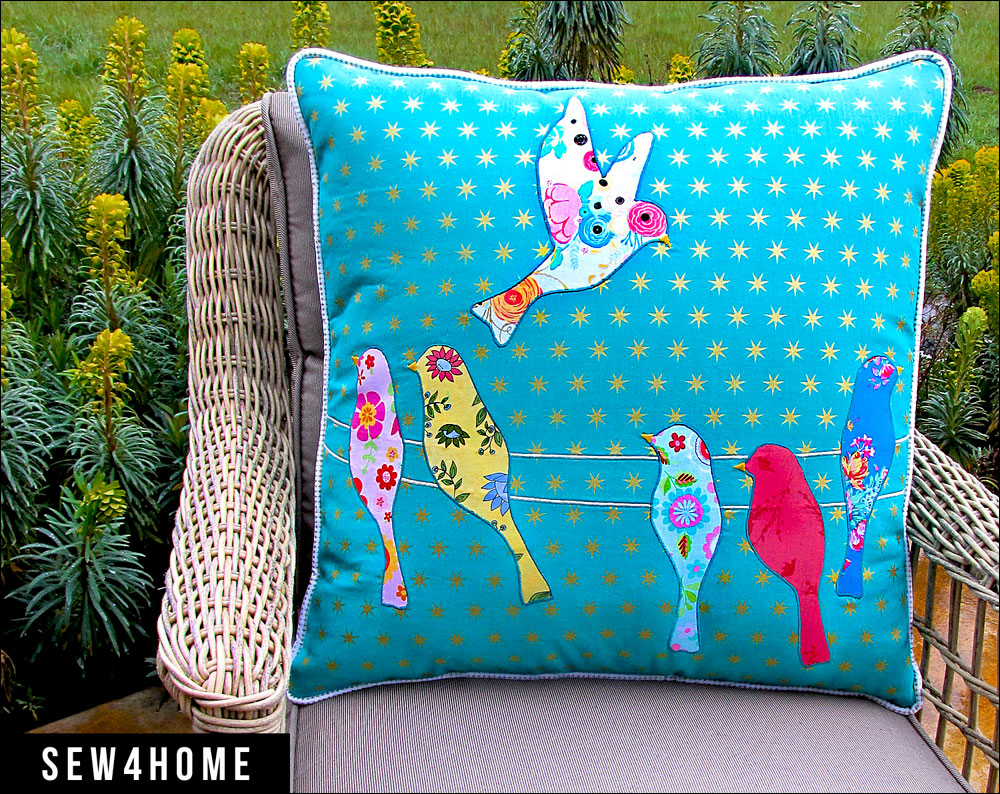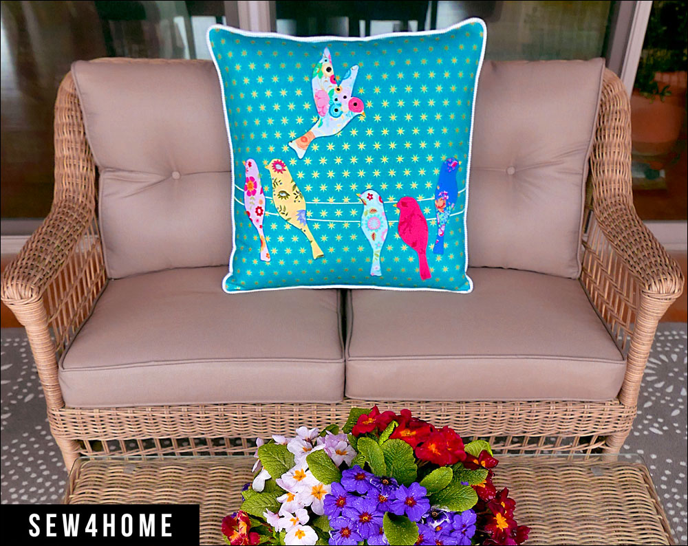 You’ll pick six favorite florals to create these fine feathered friends, then appliqué them in place on a pair of stitched telephone lines. The pillow finishes at a generous 24” x 24” with custom piping all around.