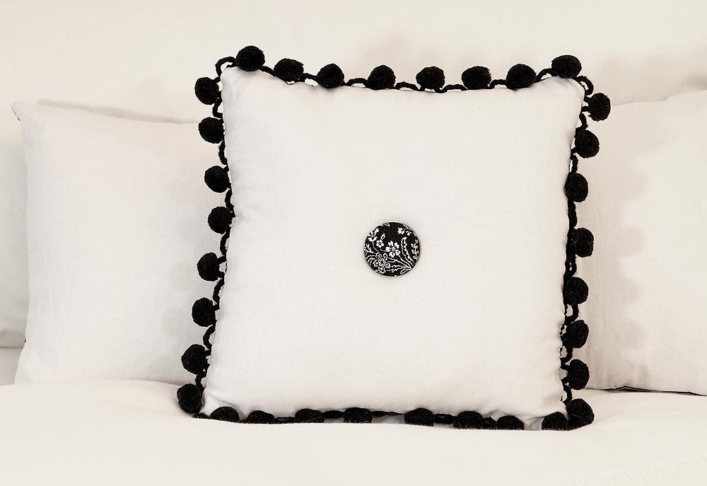 - Hand baste the pom-pom trim to the pillow back. The trim’s insertion tape should be flush with the raw edge of the fabric and the poms should be hanging down into the middle of the pillow.