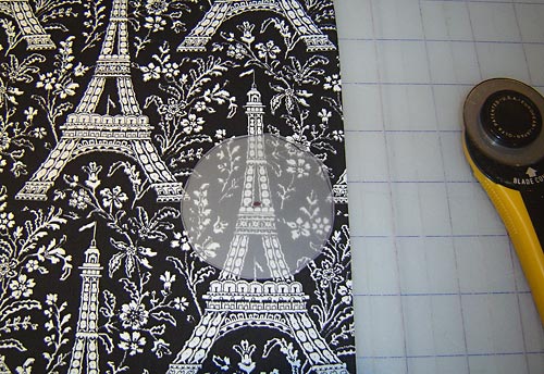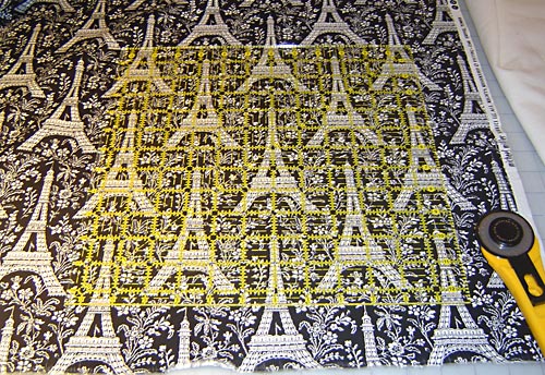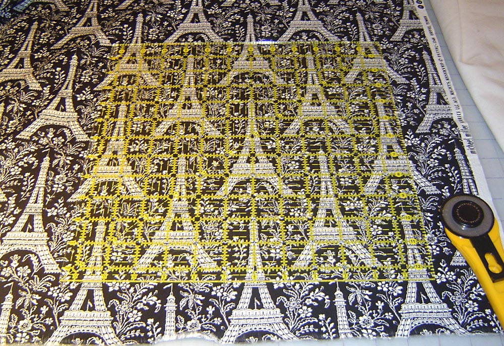 - Cut one 12″ X 12″ square from the pillow front fabric (Black Eiffel Tower in our sample). Although this is a basic square pillow, we wanted to play with the fabric a bit and decided to position one of the Eiffel Towers on the fabric smack dab in the center of our pillow front. We used a 12½” square quilt ruler to help us find a center point and cut our square. You could also cut a 12″ x 12″ pattern from a transparent material and use this to position and cut. To learn more about how to fussy cut fabric, check out our tutorial: How to Fussy Cut.