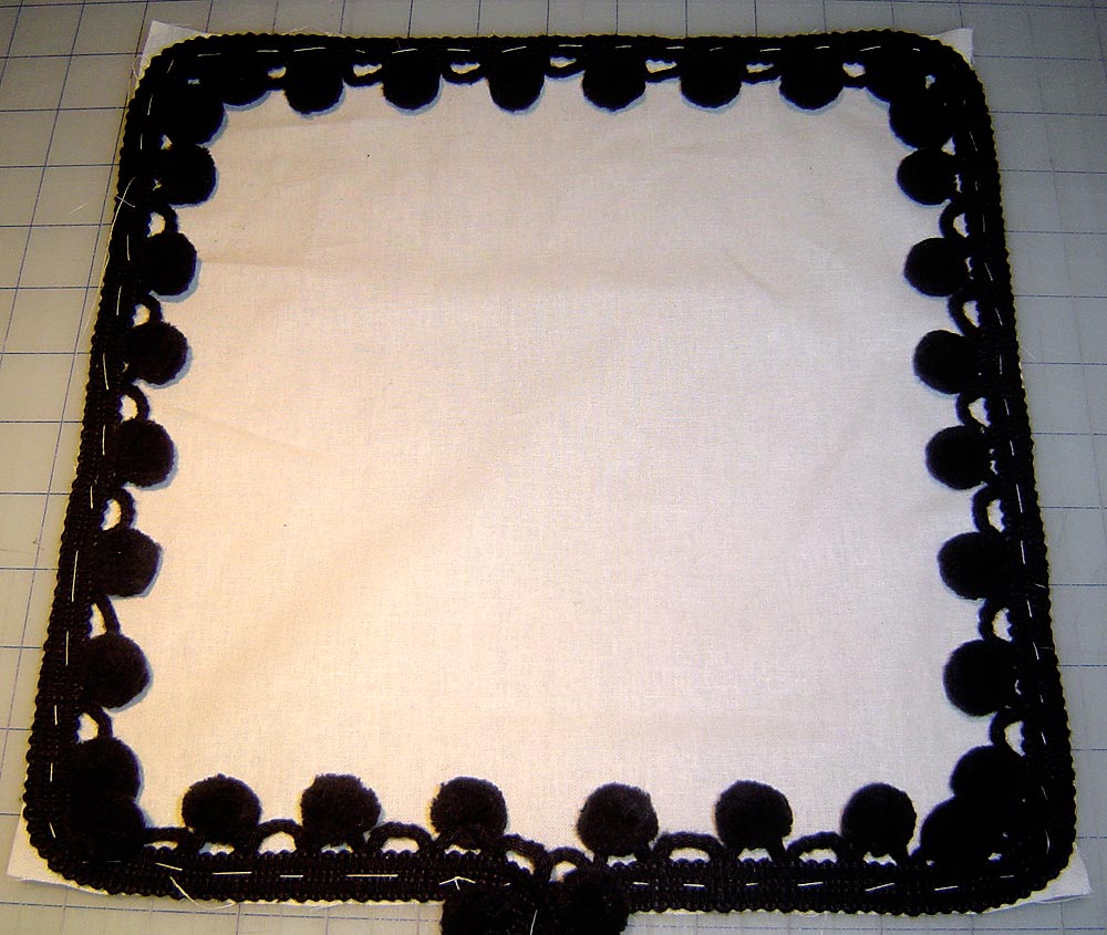 - Pin the pom-pom trim around the pillow back square, overlapping it in the center of one side. Trim off excess poms at the overlap.