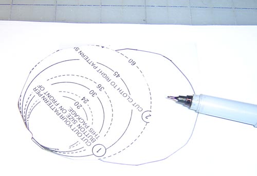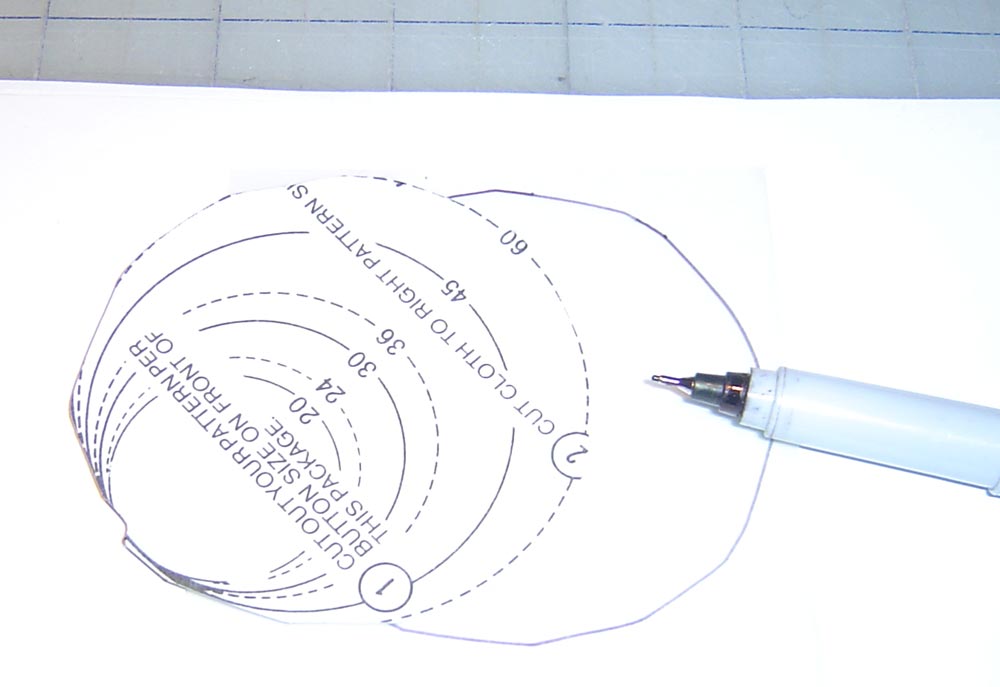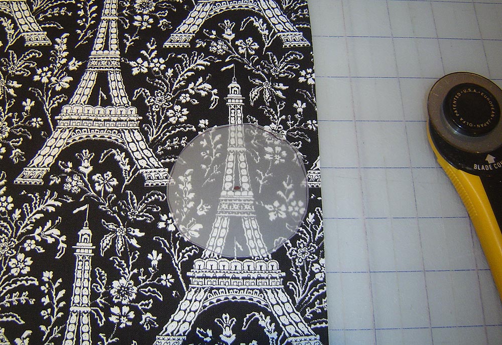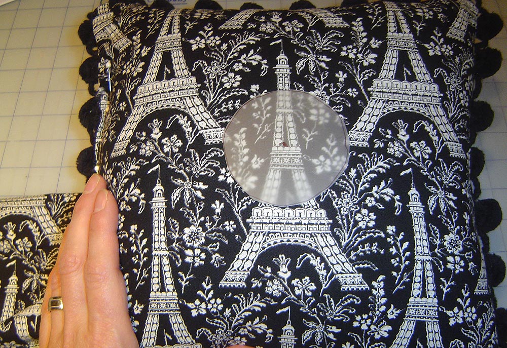 - Make a clear plastic template of the pattern from the fabric covered button kit. This is so you can see through it to position your fabric. Our goal is to cut our button fabric to perfectly match the center of the Eiffel Tower on the pillow front.