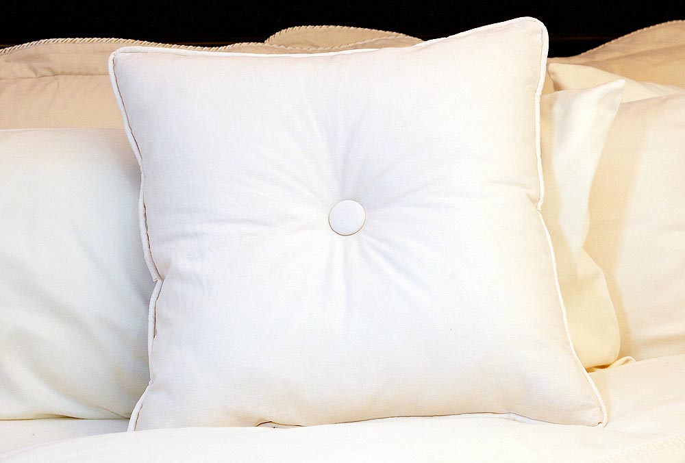 NOTE: Remember when we pressed a crosshairs on the back side to position the button? You can use this now to confirm your button position. - To make sewing all the way through the pillow easier, BEFORE you try to sew on your covered buttons, use a heavy-duty button or carpet thread and a long upholstery sewing needle, and stitch back and forth through the exact center of your pillow. This compresses the pillow filler and makes a nice little dent in the middle of your pillow where you can then stitch your buttons. Stitch on one button and then the other; don’t try to stitch them both on at once. If you’re still having challenges, try a curved sewing needle.
