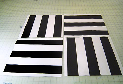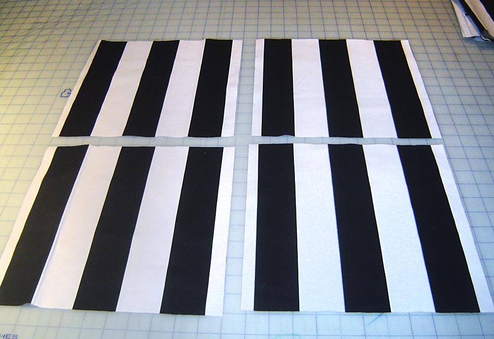 - Cut four identical 11″ x 11″ squares from the black and white stripe fabric, paying attention to the stripe as described above.
