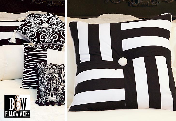 One of the most classic decorating palettes is black and white. It never goes out of style and is anything but ‘basic.’ The combination can look crisp and casual or sophisticated and stylish. Black is a color that anchors and grounds; in fact, any room will benefit with a bit of black to add definition to its focal point color. We have a whole week of beautiful black and white pillows for you, starting today with our extra-large Squares & Stripes. Its dramatic pinwheel center is achieved with clever cutting and careful seaming.
