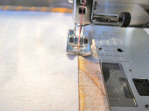 - There is a center line woven into the design of the FOE. This line will help you fold the elastic exactly in half so you can use it as a binding for the top of the pocket.