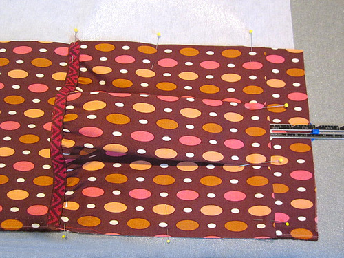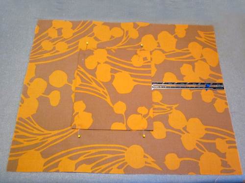 - Create an approximate 2½” pleat at the bottom center of the pocket. To do this, simply find the center of the pocket, measure 1¼” to the left and to the right of center and mark both points with a pin. Tuck under the pocket’s excess fabric at both of these marked points until the bottom of the pocket lays flat against the fabric panel. Pin in place. Adjust as needed to make sure your pleat is centered.