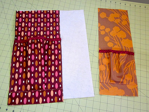 - Place the narrow panel over the wide panel, sandwiching the pockets in between the layers and aligning the inside raw edges. Pin in place through all the layers.