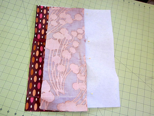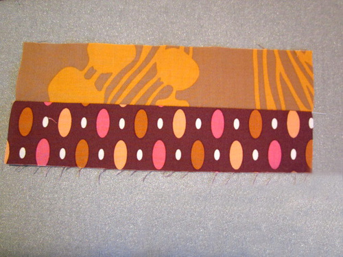 - Place both sets of the fabric strips right sides together. Pin along one long side.