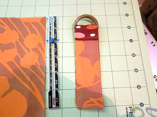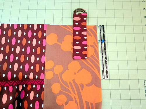 - Find the two D-rings. Slip one end of the strap tab through both rings and fold it back on itself 1″. Stitch across to secure.