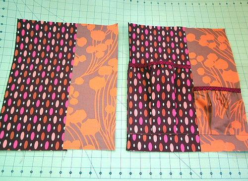 - Place the two lining pieces right sides together, sandwiching the pocket between the layers. Pin in place along both sides and across the bottom.