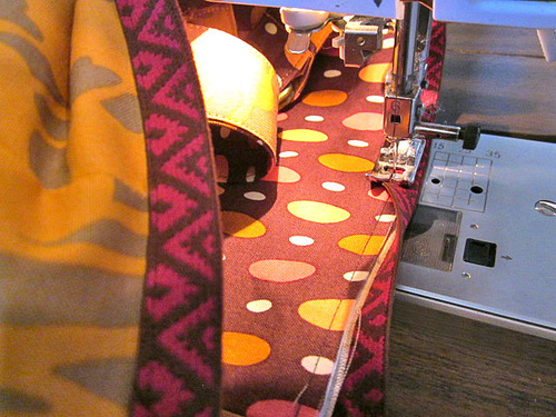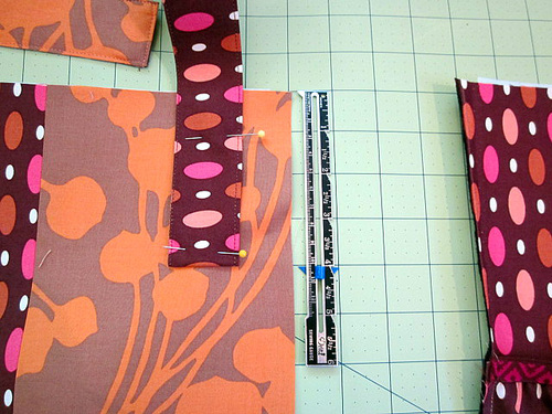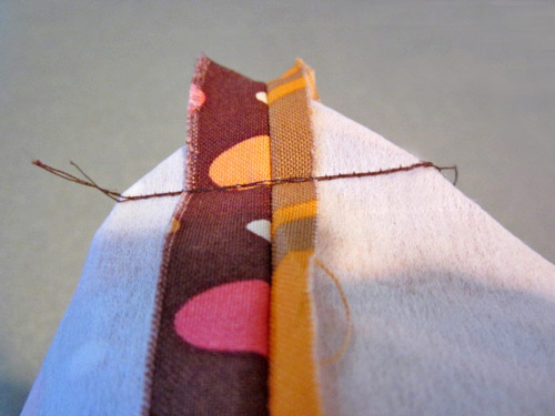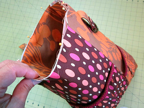- Using a ½” seam allowance, stitch the center seam through all the layers (including the interfacing). Backstitch slightly when you stitch over the pocket tops, giving this stress point some extra strength.