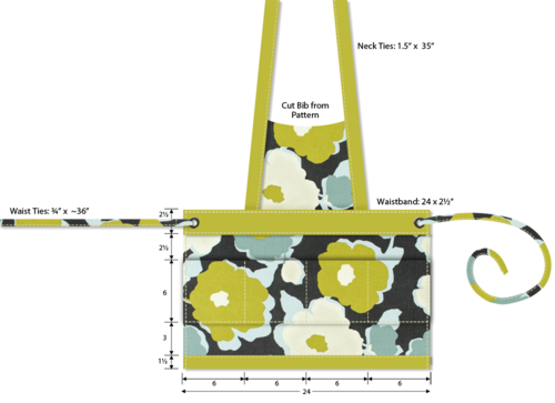 As with store-bought aprons, our design is meant to be one-size-fits-all. However, we realize you may still wish to make yours smaller or larger. As a reference, the waistband panel is approximately 24″, the waist ties are each approximately 36″ long (longer than traditional as they are meant to wrap around and tie in the front), the neck ties are each approximately 35″ long, the skirt length is about 15½”, and the bodice is about 12″ wide (along the base at the waistband) and 9″ high from the top of the waistband to the lowest point of the neckline curve.