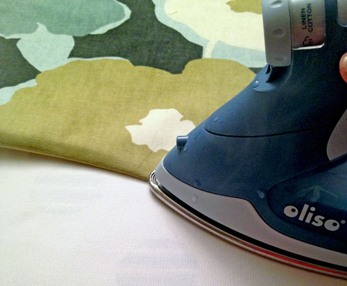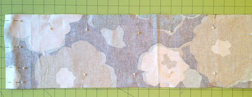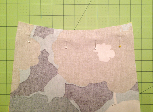- Place the skirt panel (with the side hems pinned in place) right side up and flat on your work surface.