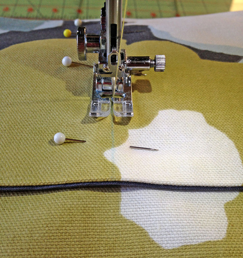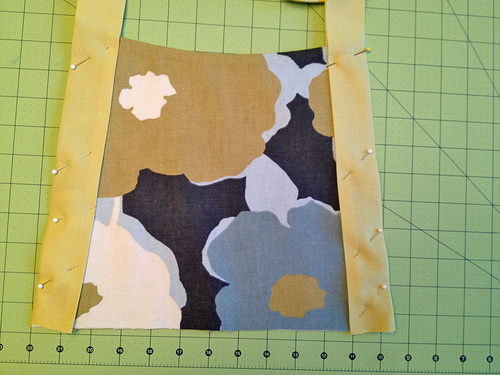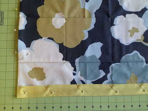 - If necessary, re-thread the machine with thread to best match the exterior fabric in the top and bobbin. The bottom finished edge of the pocket should sit 4½” up from the bottom raw edge of the skirt panel. Pin in place along both sides and across the bottom. Also place a few pins across each of the three drawn pocket division guidelines.