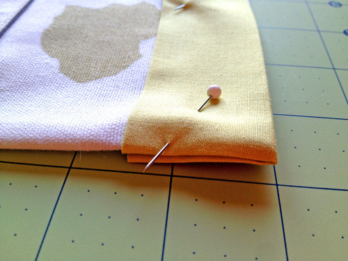 - Find the skirt panel. Along both sides (the 13½” raw edges), make a ¾” double turn hem. To do this, fold back the raw edge ⅜” and press. Fold back an additional ⅜” and press again. Pin in place, but DO NOT stitch in place quite yet.
