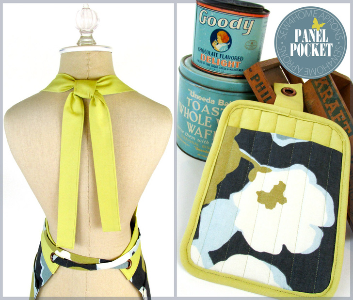 Pretty grommets hold the waist ties in place and are echoed in the matching hot pad. As a pair, they’d make a great gift for any cook on your list.