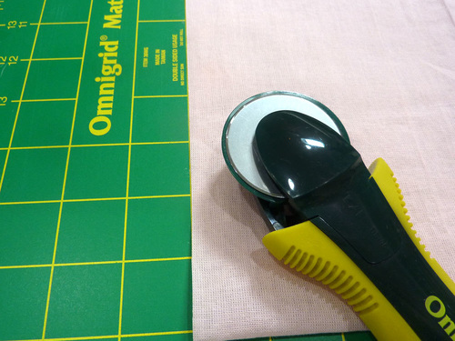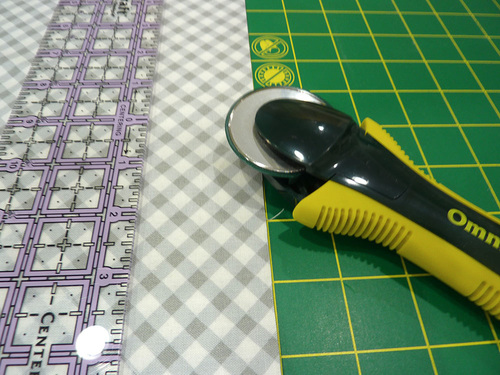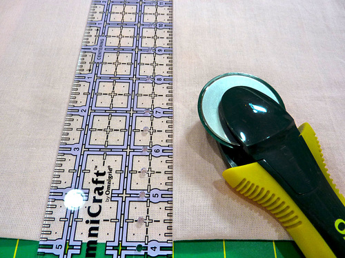- We chose a rotary cutter and ruler, using the guide lines on our cutting mat for a nice straight slice.