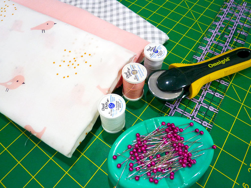 - ⅔ yard of 44”+ wide single gauze fabric for each towel; we originally used 100% Organic Cotton Single Gauze from the Tout Petit collection by Cloud 9 Fabrics in Solid Pink and Little Birds