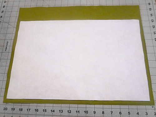 - Find the two exterior panels and the two panels of fusible fleece. Place the fleece against the wrong side of the fabric, centering it so there is ½” of fabric showing beyond the fleece along the sides and across the bottom, and 3” showing along the top. Following manufacturer’s instructions, fuse in place.