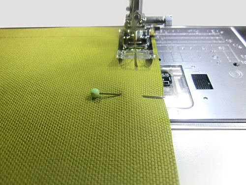 NOTE: With the seam allowance, there are a lot of layers right along the top edge of the pocket. If you struggle pulling the needle through, try using a pair of pliers for extra grip-and-pull. - Position the pocket on one exterior panel. The pocket should be centered side to side and the bottom seamed edge should sit 3″ up from the bottom raw edge of the fabric panel. Pin the pocket in place along the sides and across the bottom.