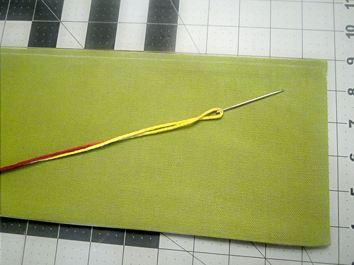 - Thread a yarn needle with a long length of cotton variegated yarn. Our sample used a 36” length of yarn.