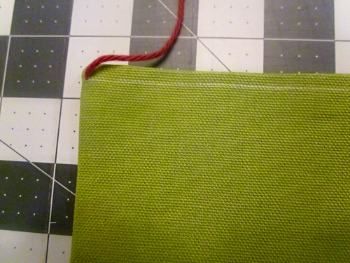 - Using the marked line for reference, start with a knot hidden inside the seam/inside the pocket. The opening you used for turning is still there; you can carefully reach through it to hide the knot inside.