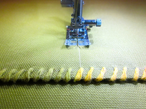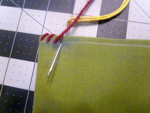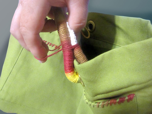 - Continue using the line as your guide to whip stitch along the top edge of the pocket, spacing the stitches about ¼” apart. The pretty variegated thread will subtly change colors as you move across the pocket top. End the hand sewing with a knot again hidden inside the seam.