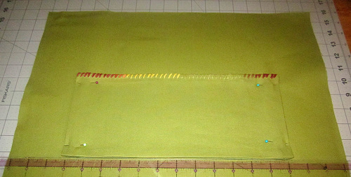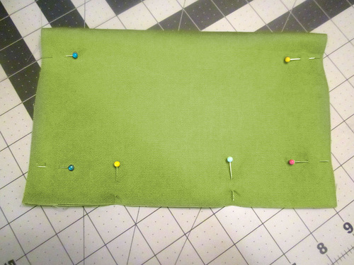 - Find the 13½” x 6½” lining pocket panel. Fold it in half so it is now 6¾” x 6½. Pin along both sides and across the bottom, leaving an approximate 3” opening along the bottom for turning.