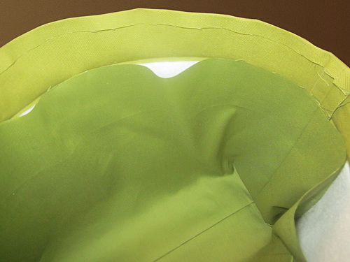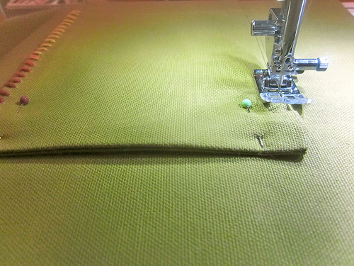 - Lengthen the stitch. Edgestitch the facing in place around the top of the bag, stitching through all layers. Start and end your seam at a side seam.
