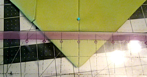 - Along the bottom you will create two reverse box corners. To do this, first flatten the corner as for a traditional boxed corner, pinching the corner out and carefully matching the side and bottom seams. Pin to hold the corner flat. Using a ruler, slide it up from the point of the corner until you reach a width of 4”. Using a fabric pen or pencil, draw a 4” line across the corner. The gridlines of the ruler will help keep the line perpendicular to the seam.