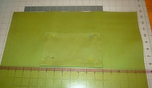 - Position the pocket on one lining panel. The pocket should be centered side to side and the bottom seamed edge should sit 3¾“ up from the bottom raw edge of the fabric panel. Pin the pocket in place along the sides and across the bottom.
